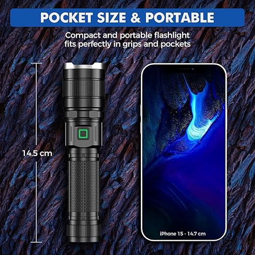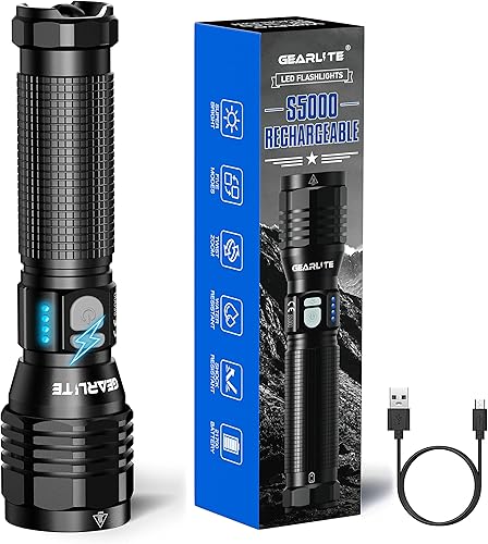 GEARLITE Taschenlampe LED Aufladbar, 10000 Lumen LED Taschenlampe Extrem Hell mit 3 Modi, IP65 Wasserdichte Taschenlampe Zoomable für Camping, Wandern, Outdoor, Notfall
