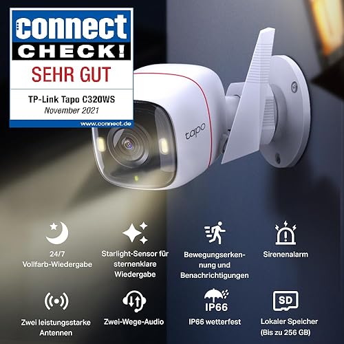 Tapo TP-Link C320WS Überwachungskamera Außen, WLAN IP Kamera, 4MP Hochauflösung, 30m Vollfarb-Nachtsicht, Bewegungserkennung, IP66 wasserdicht, Alarmmeldung,Zwei Wege Audio, Weiss, 1 Stück